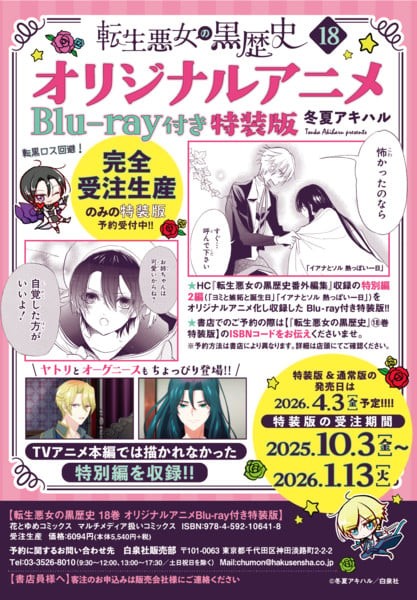 The OVA, bundled with the 18th volume of the manga, presents two new stories that expand on the main narrative. The first story, Yomi, Jealousy, and a Birthday, focuses on the complex and possessive feelings of Yomi, exploring his jealousy and his relationship with Iana during a birthday celebration. The second story, Iana and Sol's Feverish Day, is a lighter, more character-driven episode depicting a day when Iana and Sol are both bedridden with a fever, leading to moments of vulnerability and intimacy between the former villainess and her devoted butler. Produced by Studio Deen, the OVA maintains the series' signature blend of comedy, romance, and isekai fantasy, allowing fans to spend more time with its self-aware heroine and the cast of characters she originally created as fictional archetypes but has come to know as real people.
